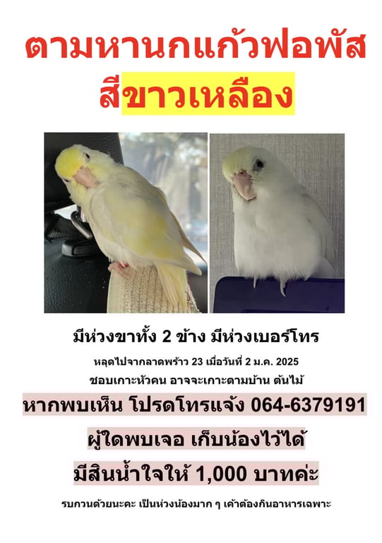 รอยตำหนิ: ตาแดง มีห่วงขาเบอร์โทรทั้ง 2 ข้างชอบเกาะหัวคน
