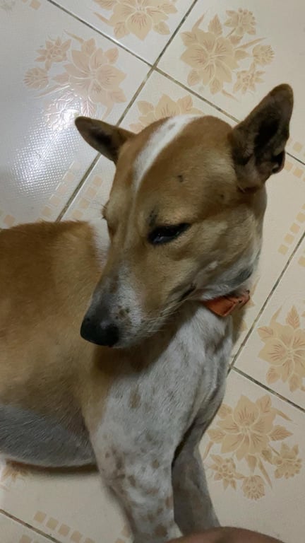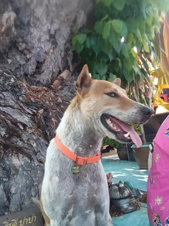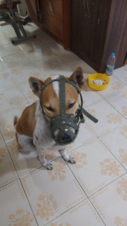 รอยตำหนิ: ขาหลังข้างขวาหัก แต่เดินได้ปกติ ตอนหายไปใส่ตะกร้อครอบปากสีเขียวตามภาพเลย