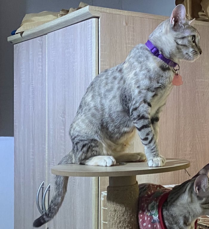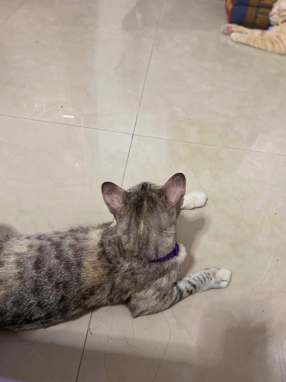 รอยตำหนิ: มีสีขาวคล้ายใส่ถุงเท้าที่ขา มีรอยแผลเป็นจากการทำหมันที่ท้อง สีผสม3สี ขาวเทาครีมขี้กลัว ชอบวิ่งเร็ว ชอบแอบ