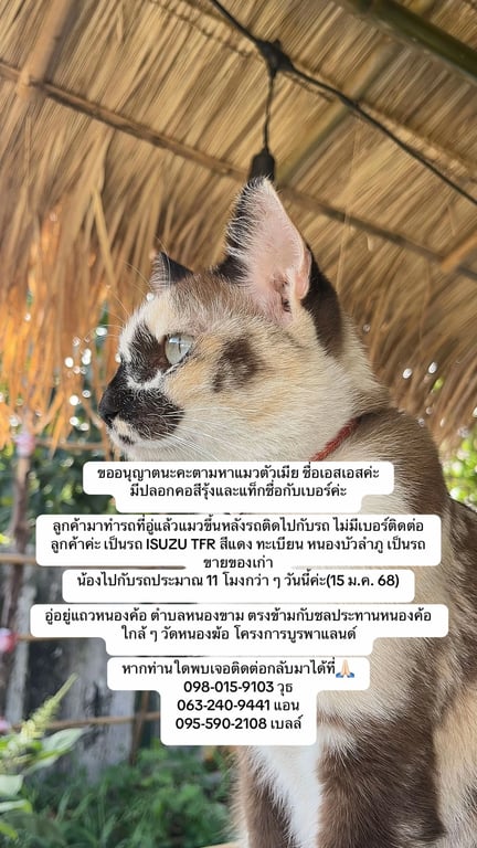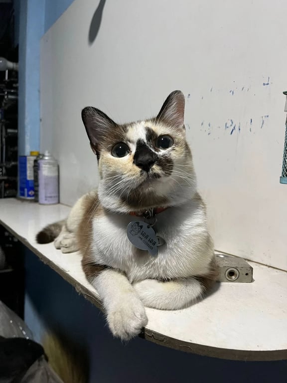 รอยตำหนิ: จมูกสีเปรอะออกมาหน้าแก้มซ้าย ตาสีฟ้าไม่กลัวคน ชอบเดินเข้าหาให้คนเกาให้ แต่จะไม่ให้อุ้ม