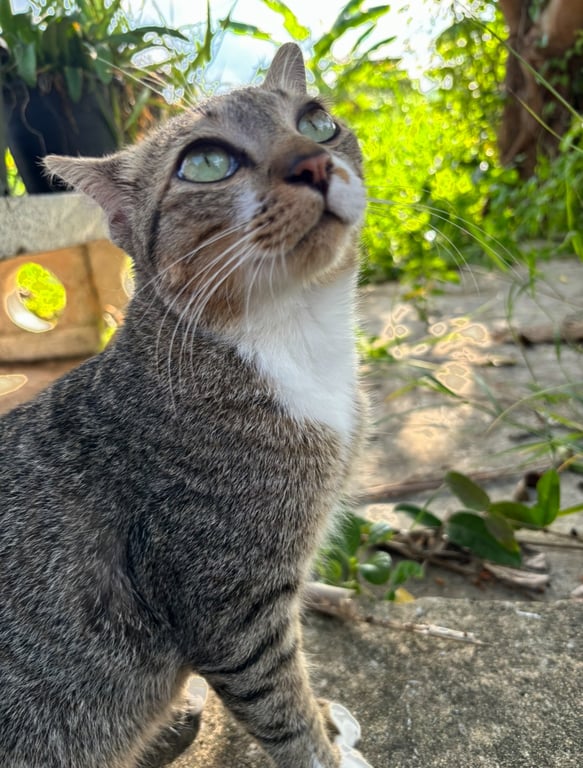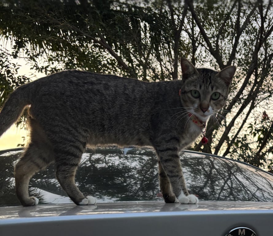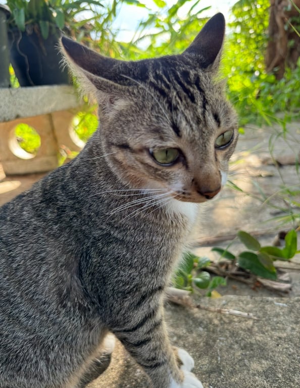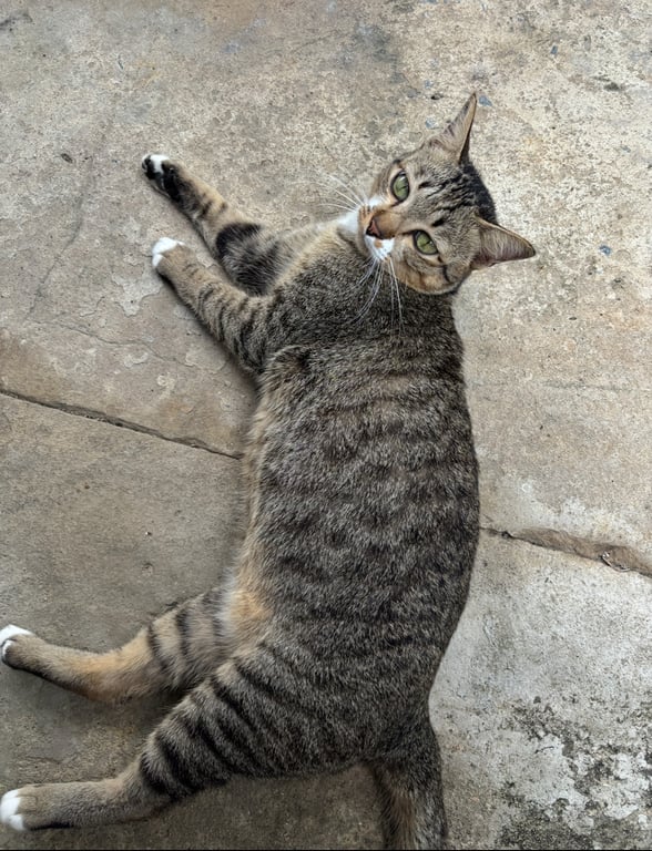 รอยตำหนิ: ลายสลิด อ้วนแมวอ้วน ลายสลิด ปลอกคอสีแดงส้มมีกระดิ่ง