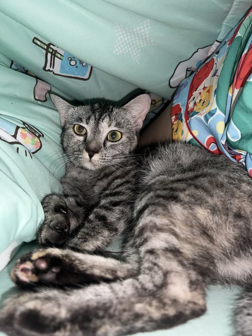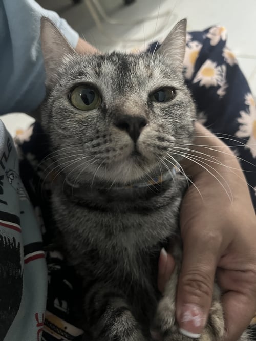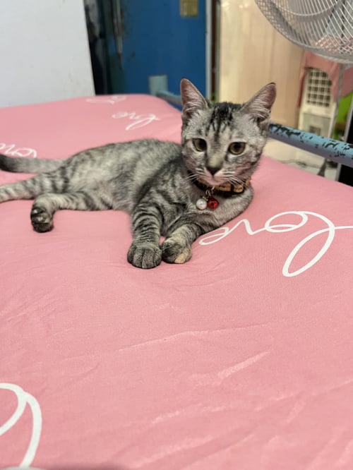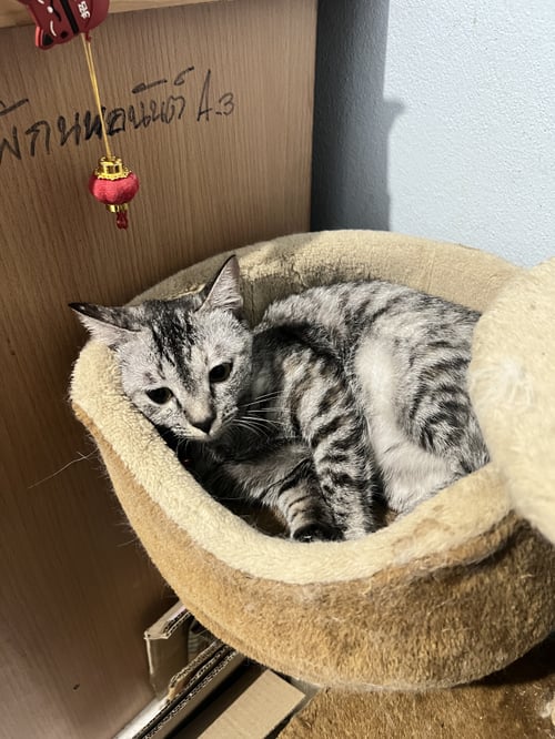รอยตำหนิ: แมวหลังอาน/ใส่ปลอกคอสีฟ้ามีโบว์น้องจะชอบนอนกับคนค่ะ