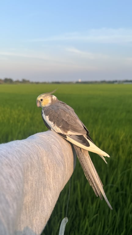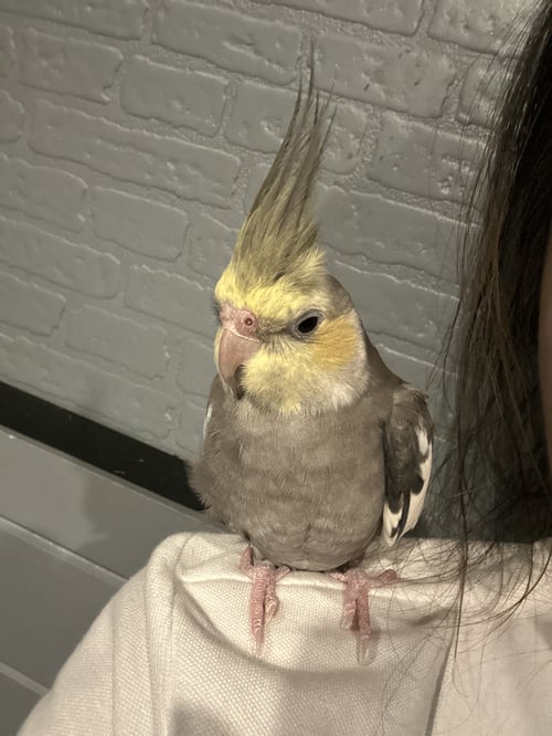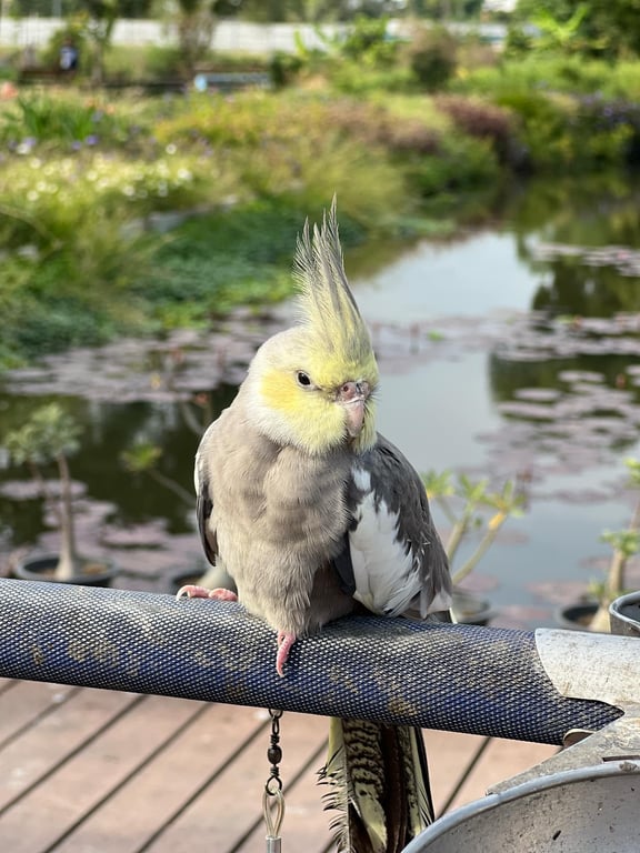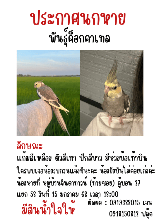 รอยตำหนิ: แก้มสีเหลือง หัวมีหงอน ตัวสีเทา ปีกสีขาว มีห่วงข้อเท้าบินติดคน ตกใจง่าย ขี้อ้อน