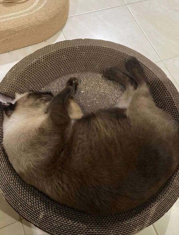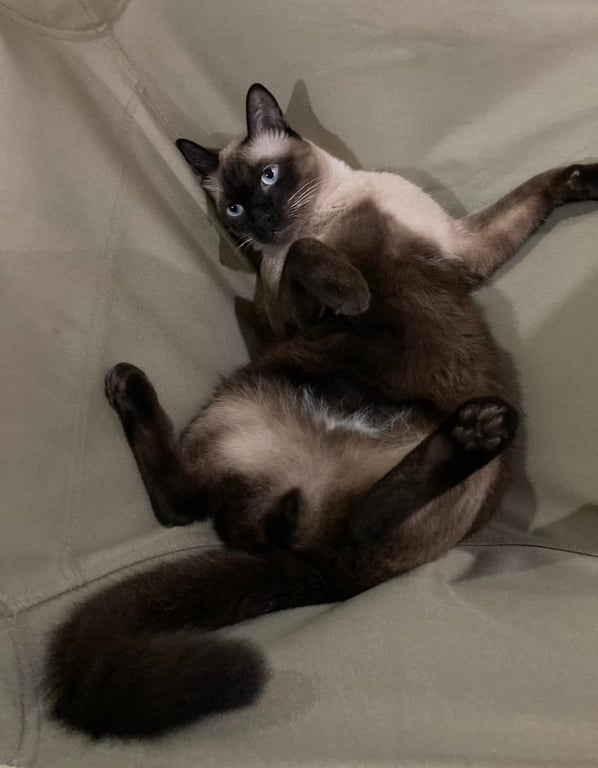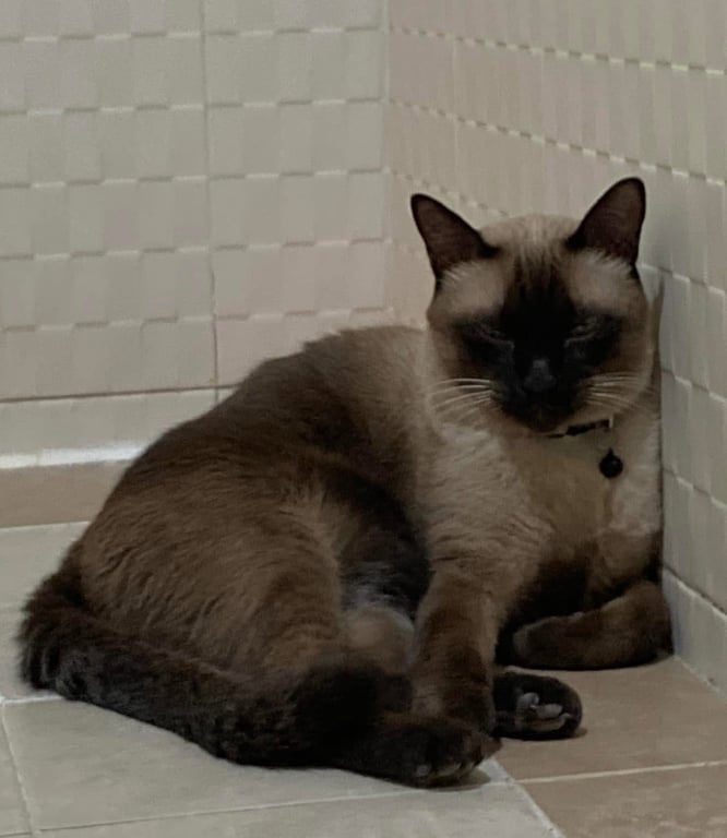 รอยตำหนิ: มีขนสีขาวนิดหน่อยที่ท้องล่างรู้จักชื่อตัวเอง ขี้อ้อน เป็นแมวที่ไม่เคยไปไหนไกลเรียกแล้วมาหาค่ะ