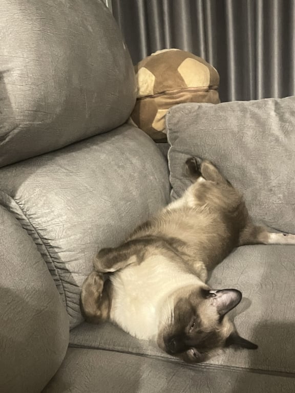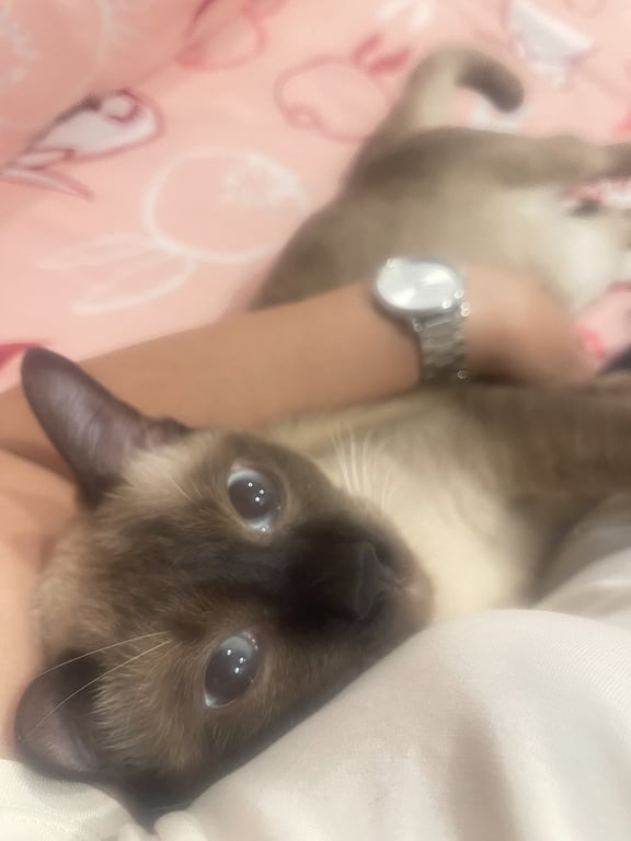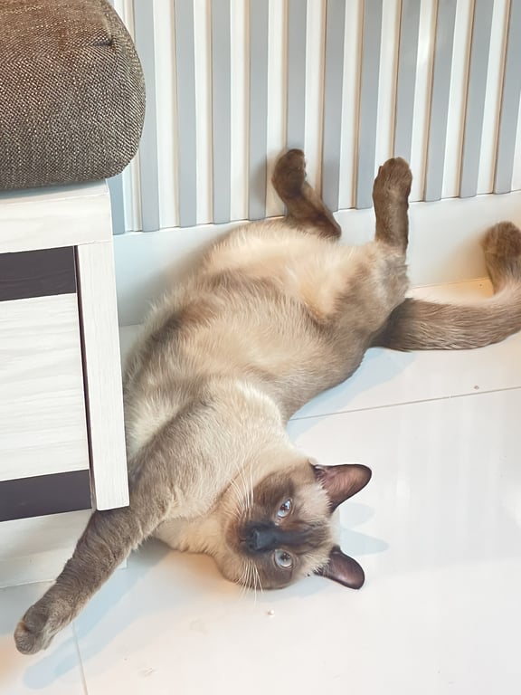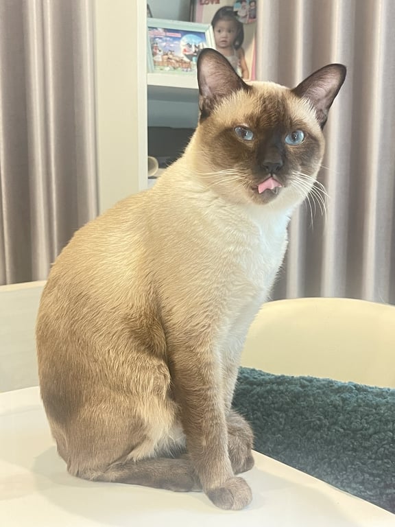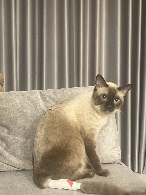 รอยตำหนิ: มีแผลที่หาง โดนโกนขนที่หางไปกลัวคน ชอบมุดหลบ ดื้อ ขนสีขาว หน้า หู ขาหลังขาหน้า ท้อง มีสีดำ เปลี่ยนสีตามอุณหภูมิ ตาเปลี่ยนสีตามแสง จากดำเดป็นแดง เป็นฟ้า