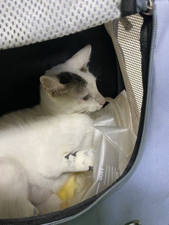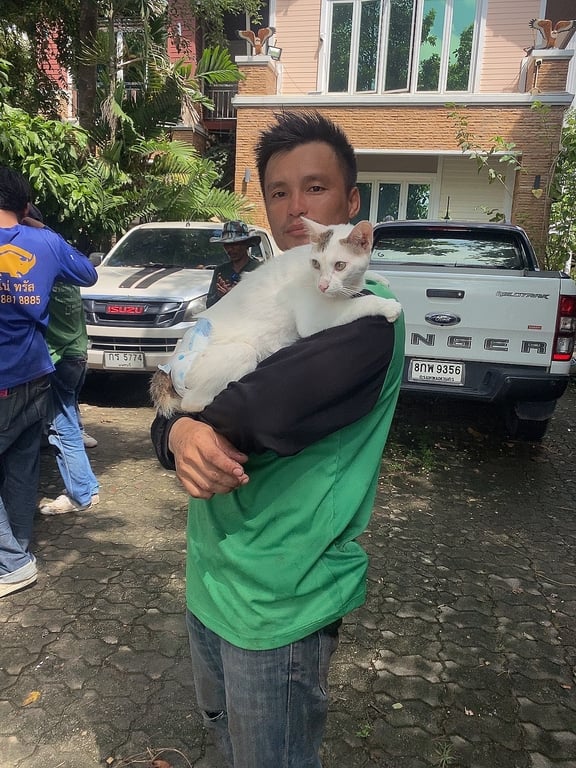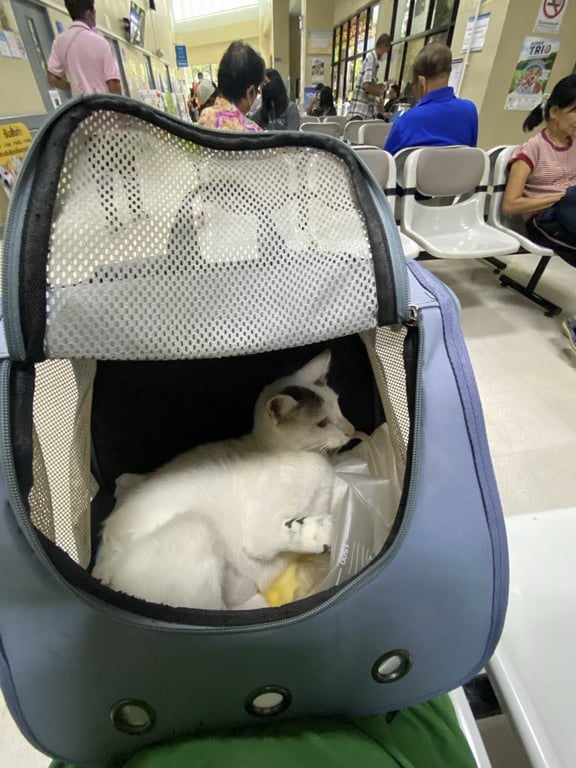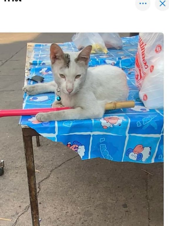 รอยตำหนิ: ตัวขาวหางลายๆดำๆ ตรงหัวมีสีดำ ปลอกคอสีฟ้าแมวจรอายุ1ปีครึง