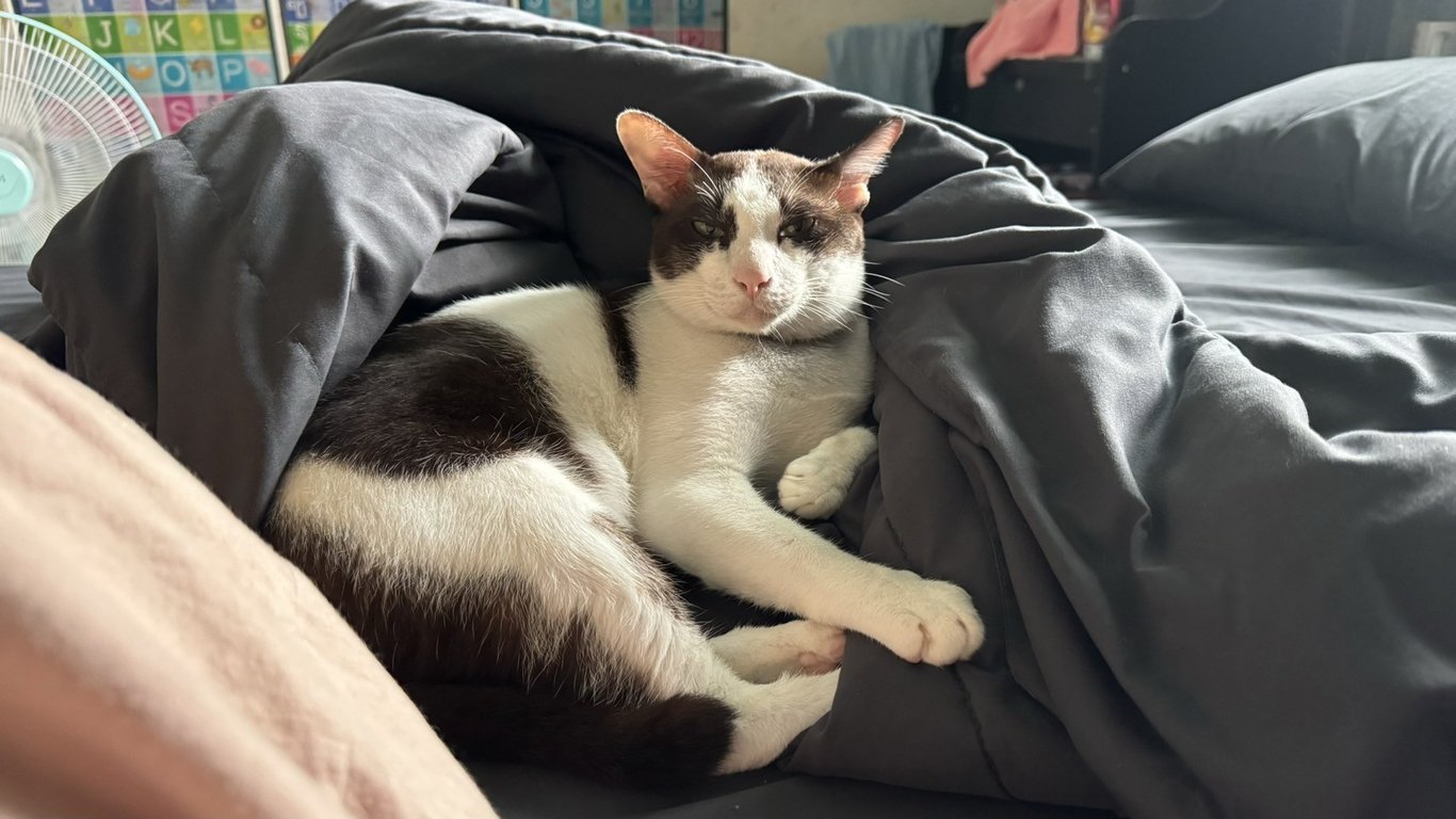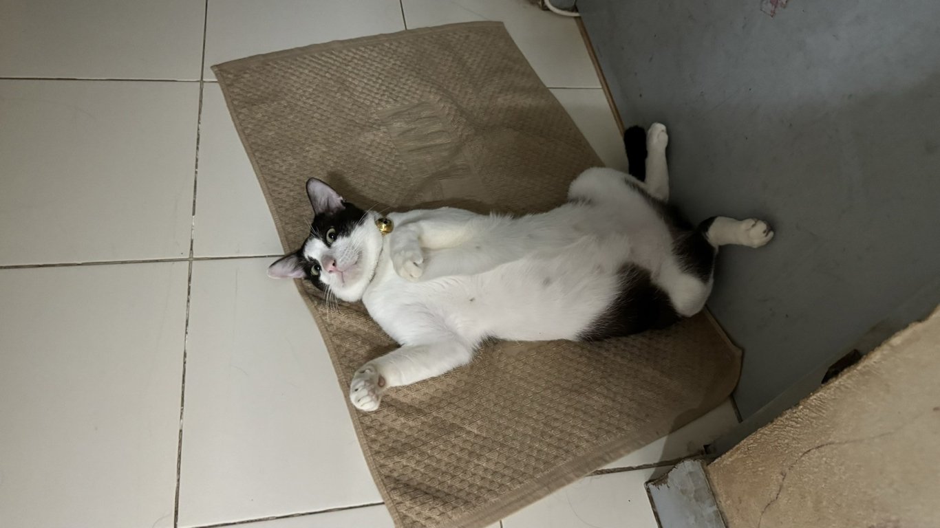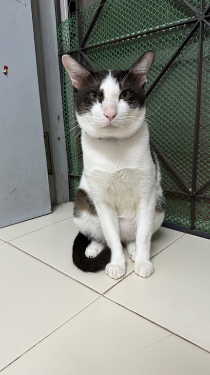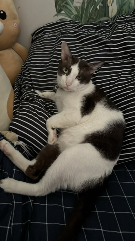 รอยตำหนิ: ขนรอบคอเป็นสีดำเนื่องจากสร้อยคอสแตนเลสกัดสีขนจนดำเป็นรอยสร้อยแมวลายวัว สีขาว-น้ำตาลเข้มเกือบดำ อ้วน ขี้กลัว ขี้อ้อน กลัวคนแปลกหน้า กลัวสัตว์อื่นๆ
