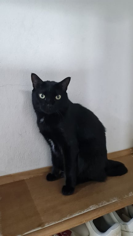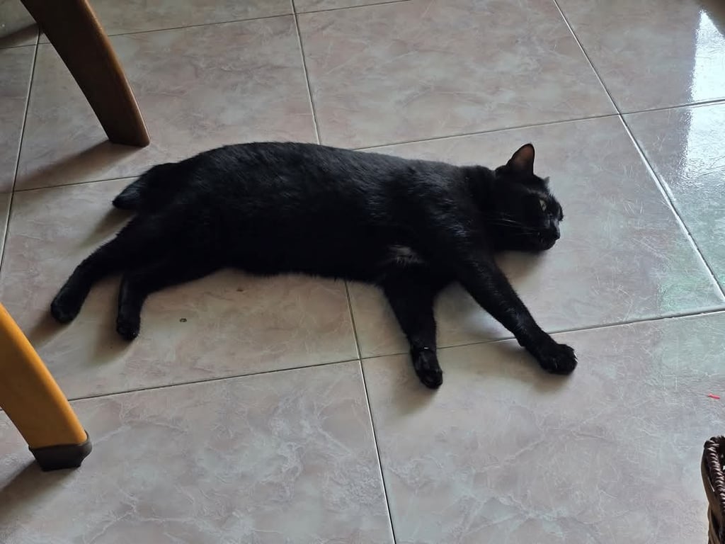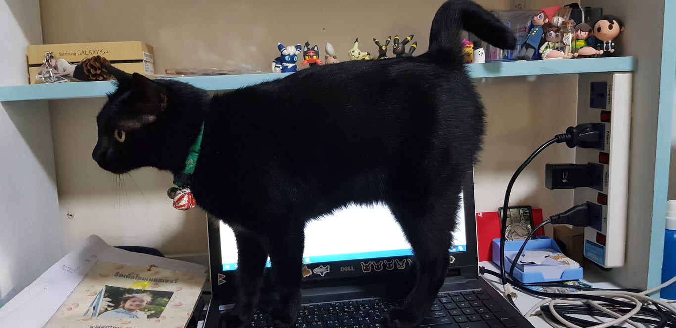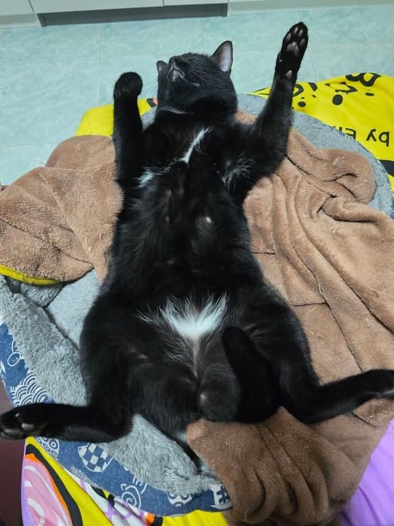 รอยตำหนิ: ตัวสีดำเกือบทั้งตัว มีสีขาวที่ท่องเป็นลายบิกินี่ หางหักเป็นเลข7 ตาสีเหลือง