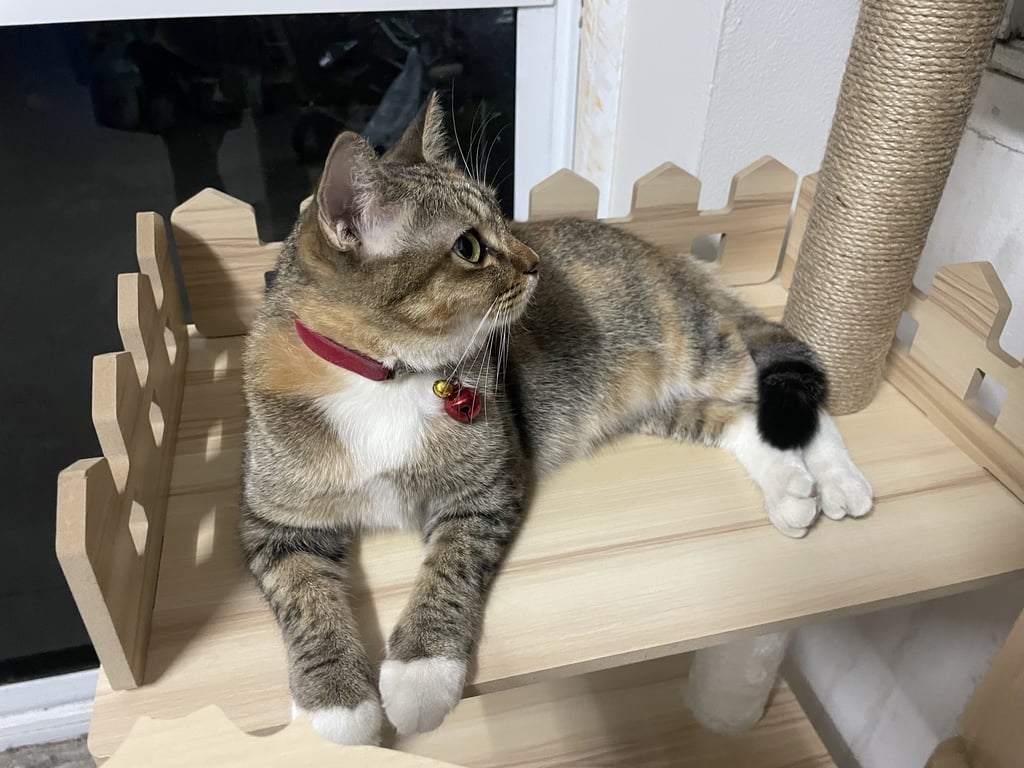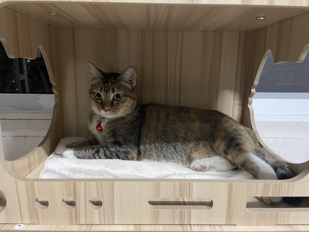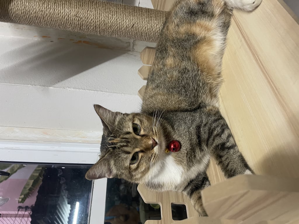 รอยตำหนิ: มีลายเหมือนใส่ถุงเท้าสีขาวทั้ง 4 ข้าง ปลายหางดอกสีดำนิสัยค่อนข้างซุกซน น้องชอบปีนต้นไม้ ชอบดูนก กินเก่ง
