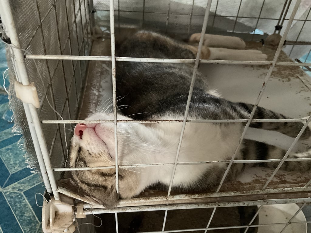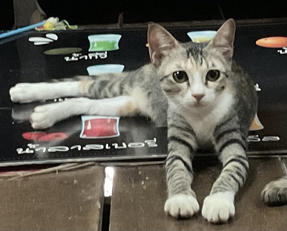 รอยตำหนิ: จมูกสีชมพู เท้าเป็นสีขาวทั้ง 4 ข้างเป็นแมวที่ขี้กลัวคน ถ้าจะจับตัวก็จะหงายท้อง