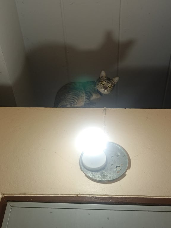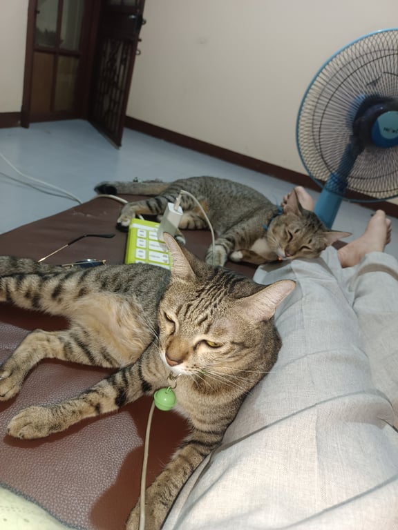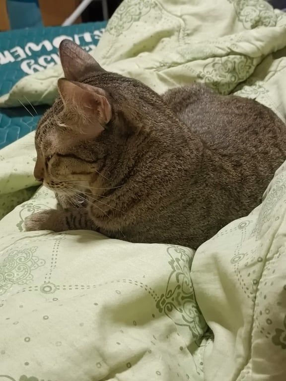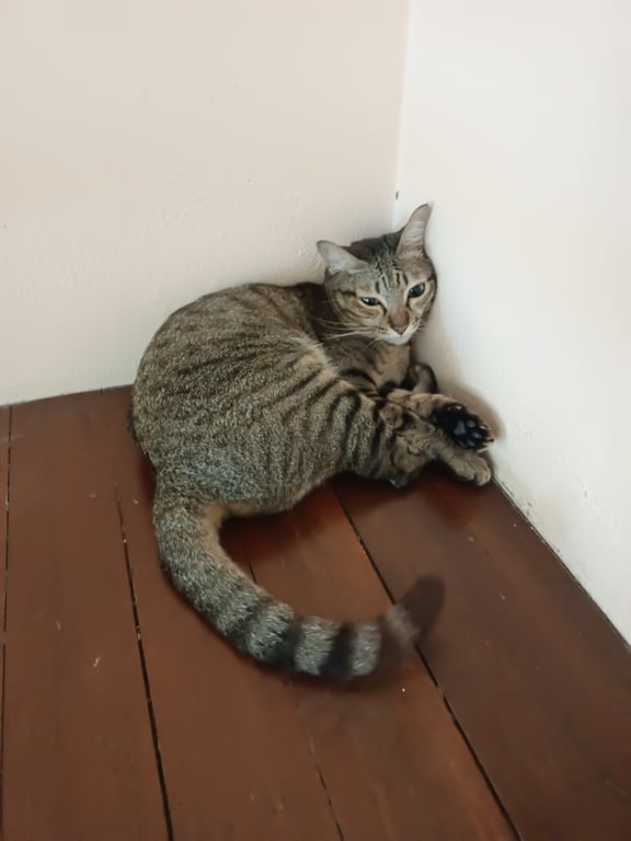 รอยตำหนิ: ลายสลิด หางยาว ไส่ปลอกคอสีม่วงไม่มีกระดิ่งกินอาหารยาก เลือกกิน ชอบให้เกาหลัง