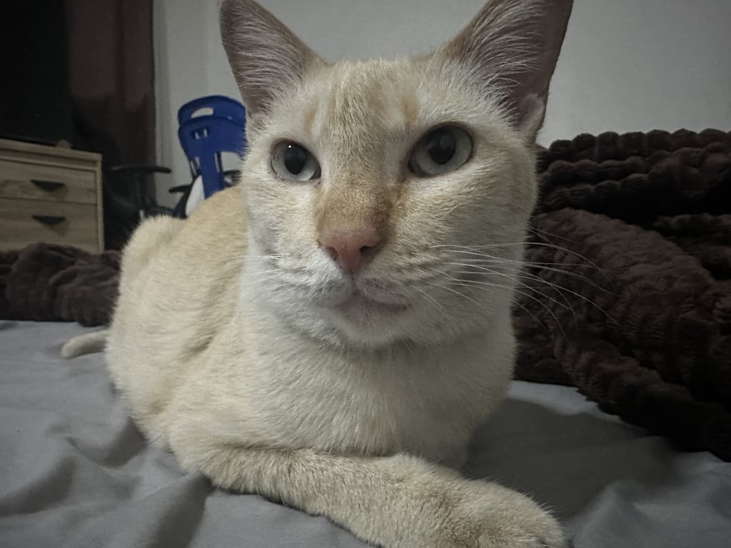 รอยตำหนิ: หางตรงยาว ตัวออกลายส้ม สีครีมขี้กลัว คุ้นเคยกับคน ไม่ชอบส่งเสียง ไม่เคยไปไหนไกล