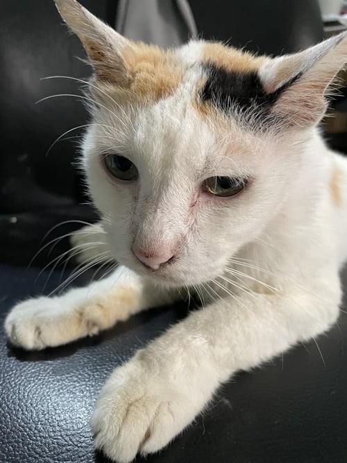 รอยตำหนิ: แมวสามสี หางงอ อายุ 16ปี ขาหน้าไม่ปกติ เดินช้าแมวสามสี / หางงอ / เดินช้า / ร้องเสียงดัง