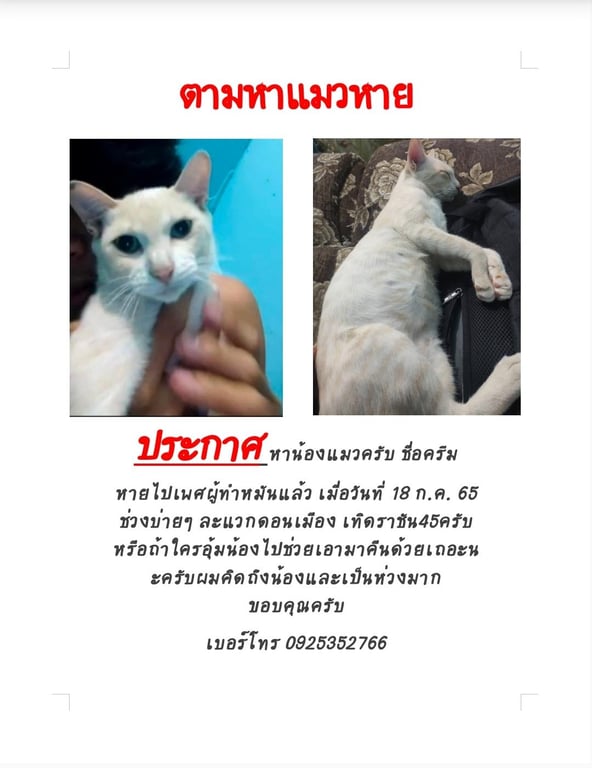 รอยตำหนิ: มีรอยดำๆน้ำมันเครื่องเปรอะตรงข้างในใบหูเล็กน้อย เเต่ตอนนี้ไม่รู้หายไปรึยังหายไป 1 เดือน กว่าๆเเล้ว หายเเถวซอย เทิดราชัน 45 สุดซอย ดอนเมือง กทม. ไม่รู้น้องเดินไปไหนเเล้วบ้าง ปกติจะให้ออกมาเล่นกับเพื่อนของเค้าเป็นปกติเเล้วค่อยเข้าบ้าน เเต่วันที่ 18 ก.ค. 65 ช่วงบ่ายๆ น้องก็หายไปเลย เอาจริงๆเดือนเกิดปีเกิดน้องไม่เเน่ใจเพราะว่าเป็นเเมวที่รับเลี้ยงมาค่ะ