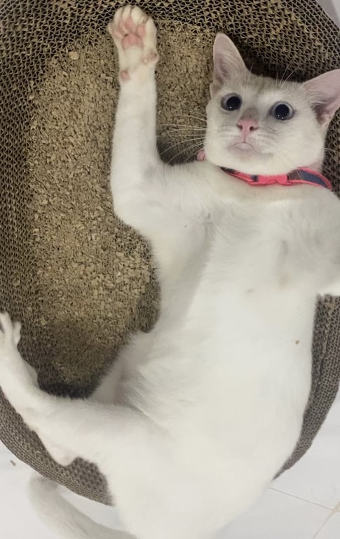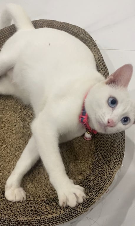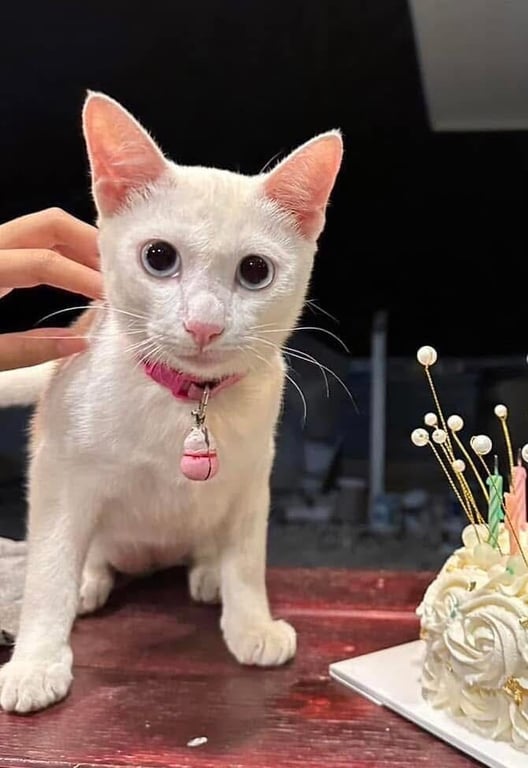 รอยตำหนิ: ตาสีฟ้า ปลอกคอสีชมพู กระดิ่งรูปแมวกวักขี้เล่น แอบดุ