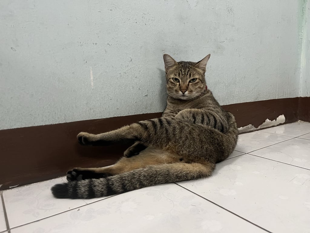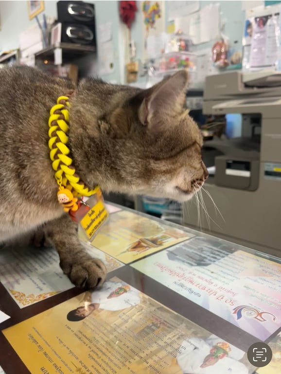 รอยตำหนิ: แมวลายสลิด/ปลอกคอสีเหลือง/กระดิ่งสีส้ม/มีป้ายชื่อสีน้ำเงินน้องเป็นแมวที่ระแวดระวังตัว/อ้อนเก่ง/สามารถจับได้ หน้าตาหล่อ/อ้วนท้วนสมบูรณ์