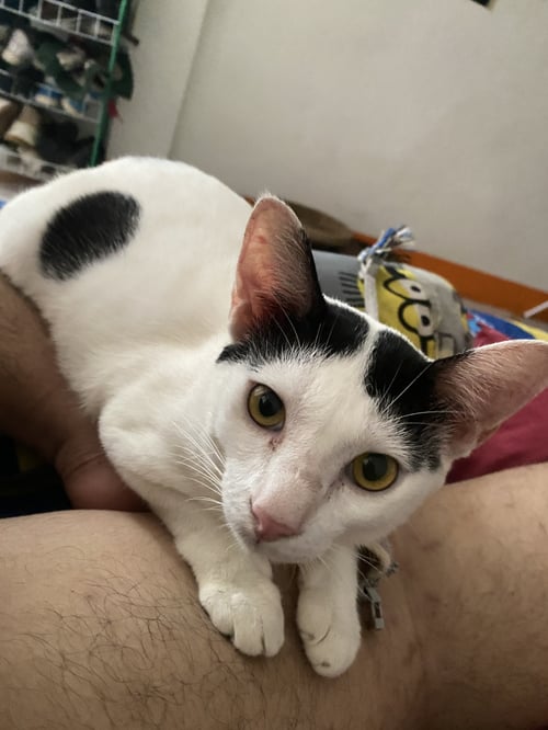 รอยตำหนิ: หัวมีแผลนิดนึง หางหักปลายน้องสีขาวลายดำมีแต้น้องมแสกกลางที่หัวน้องเป็นตัวผู้แต่มีพุงย้อยๆคล้ายแมวตัวเมีย มีแผลทีหัว ชอบอยู่กับคนขี้อ้อน ชอบนอนแขนมาก