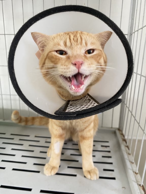 รอยตำหนิ: มีรอยโกนขน ตรงขาหน้า หูเล็ก ใส่ปลอกคอสีแดง ลายหัวใจ มีสายเคเบิลไทสีดำรัดตรงปลอกคอตาสีส้ม