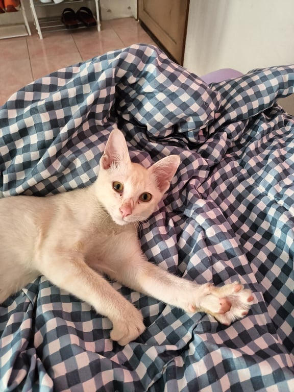 รอยตำหนิ: ตาสีเหลือง หางกวักโค้งไปทางขวา เป็นแมวขาวที่มีสีน้ำอ่อนๆมึนๆ วิ่งไม่หรือทรงตัวไม่คล่องแคล่วเหมือนแมวตัวอื่นๆ เพราะเคยประสบอุบัติเหตุ ขี้สงสัย ชอบนอนที่เย็นๆเช่น พื้นกระเบื้อง กินง่าย