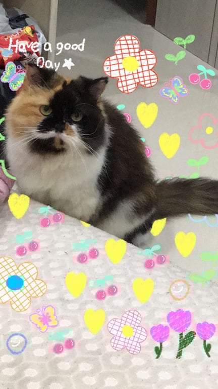 รอยตำหนิ: หน้าบากสีดำครึ่งหน้า ขาสั้นเชื้อง อ้อนคน ชอบนอนหงาย