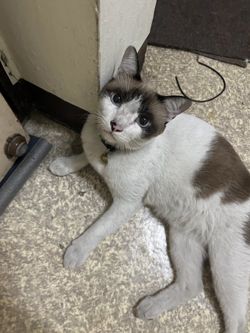 รอยตำหนิ: หางเป็นตุ้มๆ มีไฝที่จมูก ตาสีฟ้าแมวสีขาวน้ำตาล ตาฟ้า มีไฝที่จมูก ตัวยาว หางขดเป็นก้อนๆ