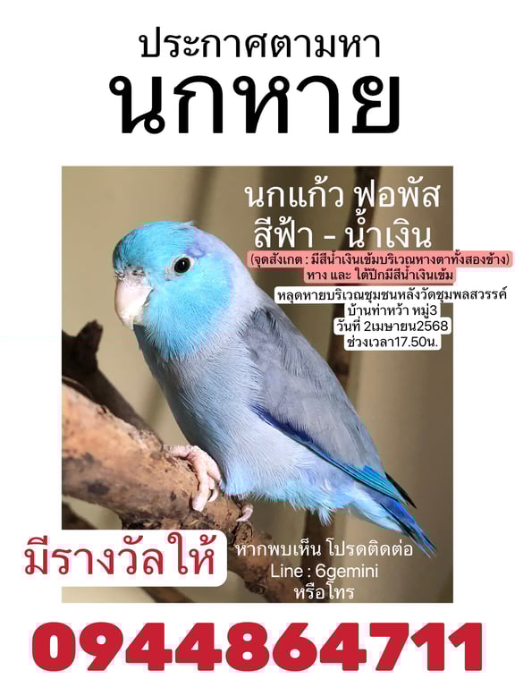 รอยตำหนิ: บริเวหางตา และ ใต้ปีกจะมีสีน้ำเงินเข้ม ส่วนหัว,ท้องและหน้ามีสีฟ้าหวงตัว ขี้ตกใจ ชอบกินกะเพรามากๆ ชอบส่งกระจก ถ้าพบเจอสามารถนำกระจกหรือต้นกะเพราไปช่วหลอกล่อได้ น้องสามารถกินข้าวเปลือกหรือข้าวจ้าวหุงสุก 📍หลุดหายออกไปจากบ้านเมื่อวันที่2เมษา2568 เวลา17.06 📍บริเวณหลังวัดชุมพลสวรรค์ บ้านท่าหว้า หมู่3 ต.บ้านค่าย จ.ชัยภูมิ ท่านใดพบเจอ โปรดติดต่อ0944864711 เป็นห่วงมากจริงๆ 🙏🏻