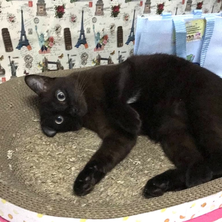 รอยตำหนิ: มีขนสีขาวเล็กน้อยที่ระหว่างช่วงอกก่อนถึงท้อง มีแผลเป็นบริเวณจมูกขนมีลักษณะสีน้ำตาลเข้ม-ดำ ตาสีเขียว น้ำหนัก 4-5 kg อายุ 5-6 ปี นิสัยขี้กลัว