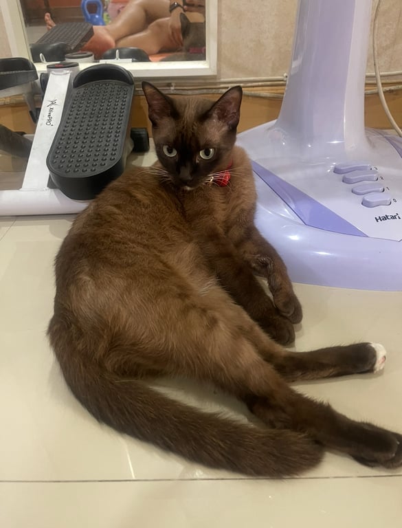รอยตำหนิ: มีจุดขาวที่คาง และมีสีขาวเท้าหลังข้างซ้ายน้องใส่สายคอกระดิ่งสีแดง ตัวสีน้ำตาลเข้มมีลายสลิดจางๆทั้งตัว เป็นแมวขี้กลัว ขี้ตกใจ ไม่ชอบให้คนเข้าใกล้