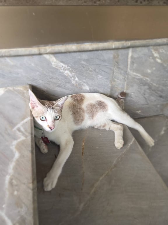 รอยตำหนิ: ปลอกคอสีเขียวห้อยแผ่นโลหะแดงเขียนว่าโรคพิษสุนัขบ้า ปลายหางพับงอ จมูกฝั่งขวามีรอยดำแต้ม ตาสีฟ้าอ่อน ขาขวาลายคล้ายปลาเผาซุกซน เข้าหาคน ชอบปีนป่ายหลังคา