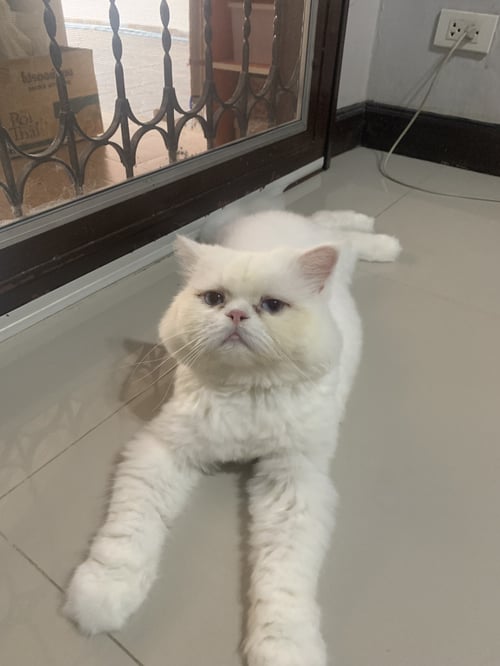 รอยตำหนิ: ขนสีขาวล้วน เพิ่งตัดขนได้ไม่นาน ตาสีฟ้า ไว้ขนพุ่มที่หางแบบในรูป