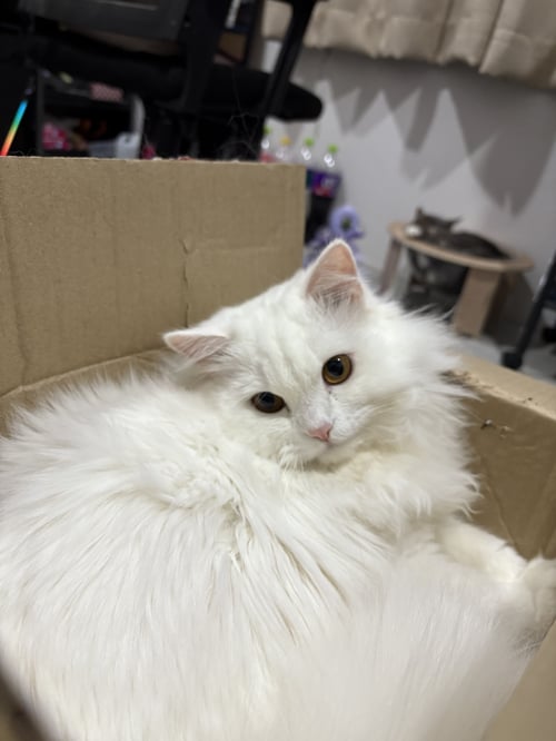 รอยตำหนิ: หางฟู มีสีน้ำตาลแซมๆที่หางเชื่อง กลัวคนนิดหน่อย ขี้อ้อน