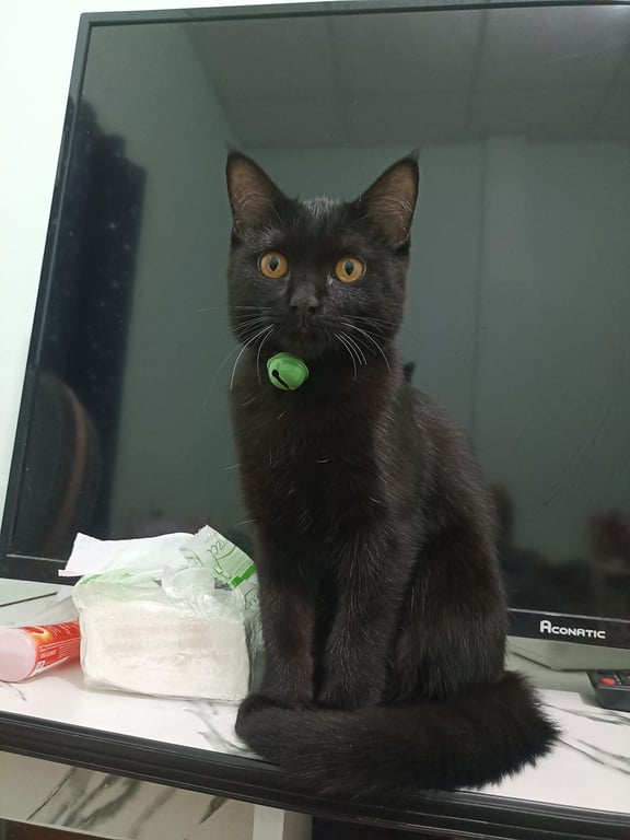 รอยตำหนิ: ดำทั้งตัว ช่วงโคนหางและช่วงขาหนีบขนจะบางปลอกคอสีชมพู ขี้อ้อน จับตัวได้ ไม่ชอบโดนอุ้ม