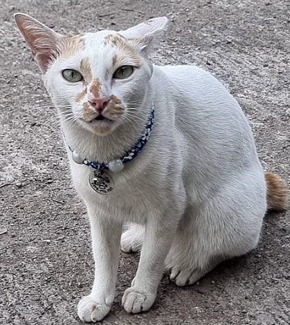รอยตำหนิ: หางกุด สีส้มมีปลอกคอ สีฟ้า มีชื่อ เบอร์โทร