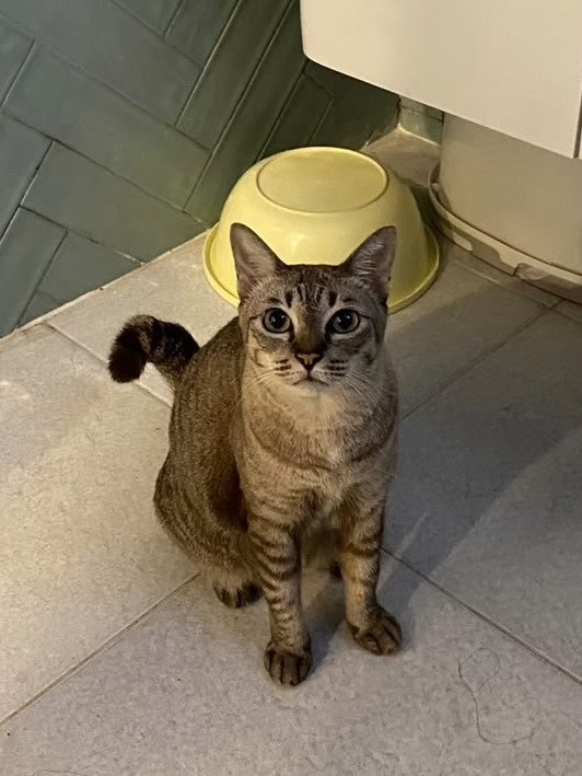 รอยตำหนิ: ปลายหางกวัก ท้องขาว ฝ่าเท้าดำอายุประมาณ 9 ปี นิสัยชอบหลบมุมเวลาฝนตก ชอบกินเปียก ๆ ปลาเส้น หมูทุบ กุ้ง กลางวันนอนทั้งวัน