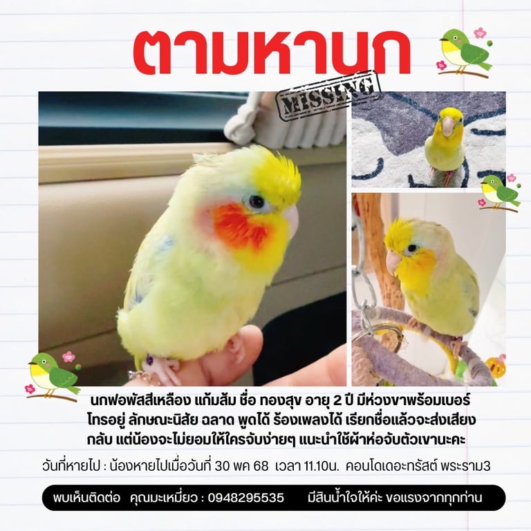 รอยตำหนิ: แก้มสีส้ม จากการแต้มทิ้นฉลาด พูดได้ ชอบเรียกหาแม่จ๋า แต่ไม่ชอบให้ใครมาแตะตัว ถ้าเจอใช้ผ้าคลุมแล้วค่อยๆจับ ติดคนมาก ชอบยาดมหงษ์ไทยเป็นที่สุด