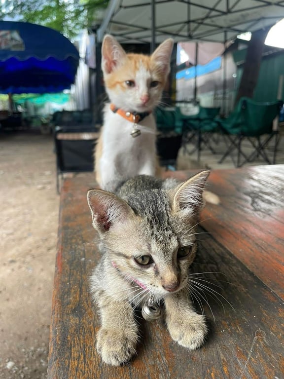 รอยตำหนิ: ลายสลิดตัวจะผอมๆน้องเป็นแมวจรพึ่งรับน้องมาเลี้ยงได้ไม่ถึง2 อาทิตย์ ตัวสีส้มชื่อเร้กเก้มีปลอกคอสีส้มเป็นเพศผู้ ตัวลายสลิดชื่อปลาทูมีปลอกคอสีชมพูเป็นเพศเมีย