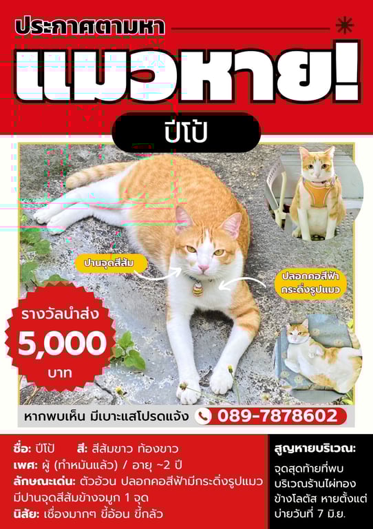 รอยตำหนิ: แต้มสีส้มใต้ตาด้านข้างจมูกขวา ลายสีส้มเหมือนใส่เสื้อถึงข้อศอก ท้องขาว ขาทั้งสี่สีขาวจมูกสีชมพูขนด้านหลังสีส้มน้ำตาลทั้งหลังเชื่อง ขี้กลัว กลัวเสียงดัง กินเก่ง ชอบอ้อน นิ่งๆ ไม่กัด ไม่ค่อยร้อง จะร้องเฉพาะเวลาขอข้าวกิน