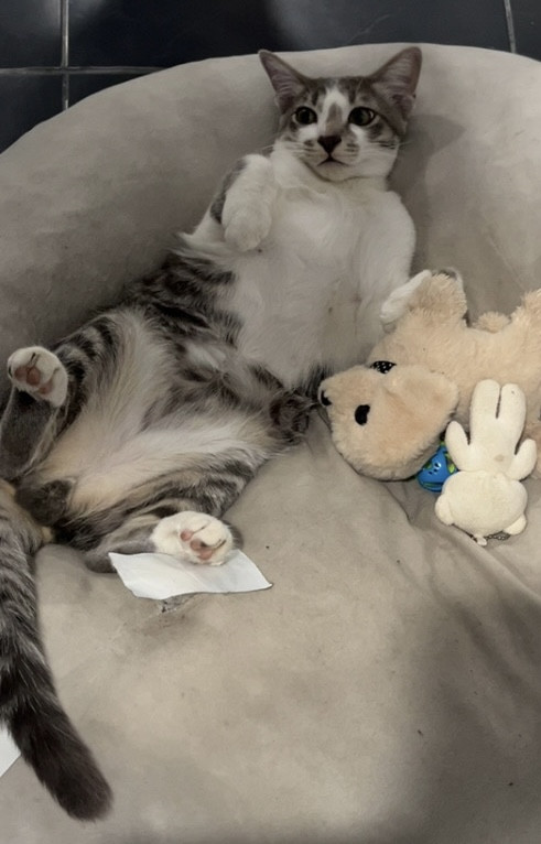 รอยตำหนิ: ทำขนสีเทาที่คอกับจมูกมีปลอกคอสีส้ม
