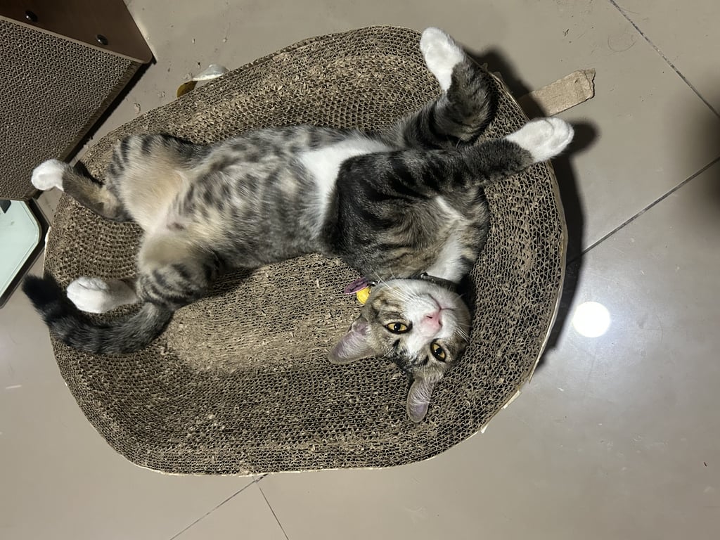 รอยตำหนิ: หน้ามีสีขาวเหมือนแรคคูน จมูกชมพู ฟันล่างเก ตัวป้อม ลายสลิดมีถุงเท้า 4 ข้าง ปลอกคอเรืองแสงห้องป้ายชื่อสีชมพูกระดิ่งสีเหลืองขี้เล่น ชอบร้องเรียก กินเยอะ ชอบให้เกาพุง ชอบกินไก่อบ เสียงเล็กๆ