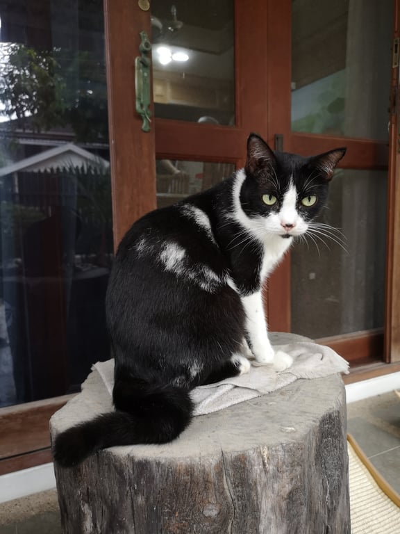 รอยตำหนิ: หางหักแมวหน้ากากสีขาวดำ ตาสีเขียว เคยเป็นจรมาก่อน ไม่ทราบอายุ อยู่ในระบบเปิดมาตลอด เอาตัวรอดเก่ง หางหักครึ่งเห็นได้ชัด เหมือนจะรู้ชื่อตัวเอง เรียกสาวแล้วหัน