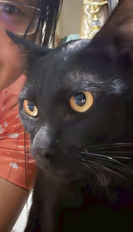 รอยตำหนิ: หางกุดเป็นพู่คล้ายกระต่าย ขาหลังมีรอยแผลหลายรอย สวมปลอกคอพื้นดำ ลายอุ้งเท้าแมวสีม่วงสลับเหลืองนิสัยเรียบร้อย นิ่งๆ ไม่ซน ขี้อ้อน ไม่ร้อง ติดคน