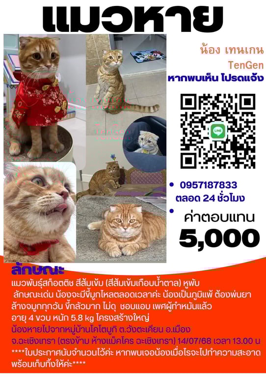 รอยตำหนิ: แมวหูพับสีส้มเข้ม น้องน้ำน้องน้ำมูกไหลตลอดเวลา น้องเป็นภูมิแพ้น้องแมวนิสัยขี้กลัวมากไม่ดุ แต่น้องจะคัดจมูกมีน้ำแต่น้องจะคัดจมูกมีน้ำมูกตลอด น้องเป็นแมวสีส้มเข้ม