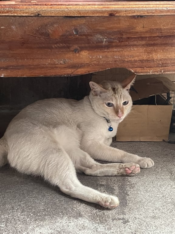 รอยตำหนิ: ขนออกสีขาวครีม หูแหว่ง จมูกสีน้ำตาล ตาสีฟ้า ปลอกคอสีน้ำเงินกลัวคน วิ่งหนีไว แต่อยู่แถวบริเวณบ้านชอบขู่กับตัวอื่น