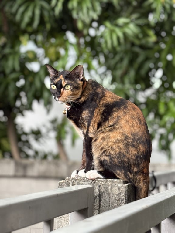 รอยตำหนิ: แมวสามสี/สีเปรอะ หูซ้ายแหว่งนิดๆ เท้าขาวแบบใส่ถุงเท้าทั้ง4เท้าขี้กลัวระแวงคนแปลกหน้า เวลาจะเรียกเขาต้องใช้ปลาเส้นทาโร่ขยำถุงล่อเขาขอบกินมาก