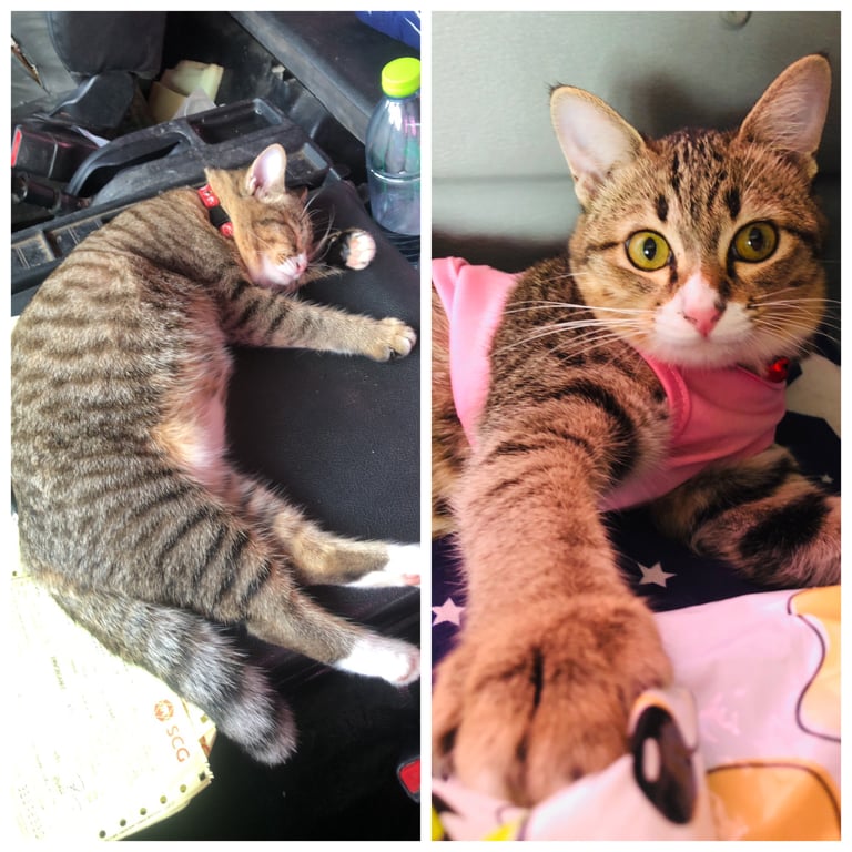 รอยตำหนิ: หน้าจมูกมีสีขาว มีถุงเท้าสีขาวขาหลังน้องเป็นแมวลายสลิด มีปลอดคอสีแดง ตัวอ้วนน้ำหนักประมาณ3กิโล