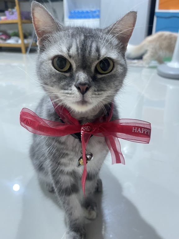 รอยตำหนิ: ขนสีเทา ขาวขี้อ้อน ไม่กลัวคน ตัวเล็กหนักไม่เกิน 3 โล 2 มีปลอกคอสีชมพูพร้อมเบอร์ติดอยู่ แต่ไม่รู้ปลอกคอจะหลุดไหม
