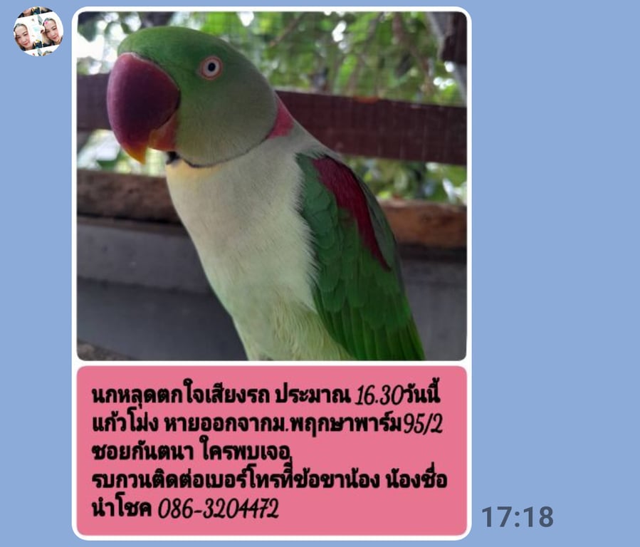 รอยตำหนิ: รอบคอเป็นวงแหวนสีชมพูเป็นนกแก้วโม่ง ตัวตั้งตัวตี รอบคอเป็นวงแหวนสีชมพู มีห่วงข้อเท้าทั้ง2ข้าง นิสัยของน้องขี้อ้อน ขี้เล่น เรียกแม่ได้ มีชื่อ รหัสและเบอร์โทรติดที่ข้อเท้า หลุดที่ ม.พฤกษาพาร์ม95/2 ซอยกันตนา