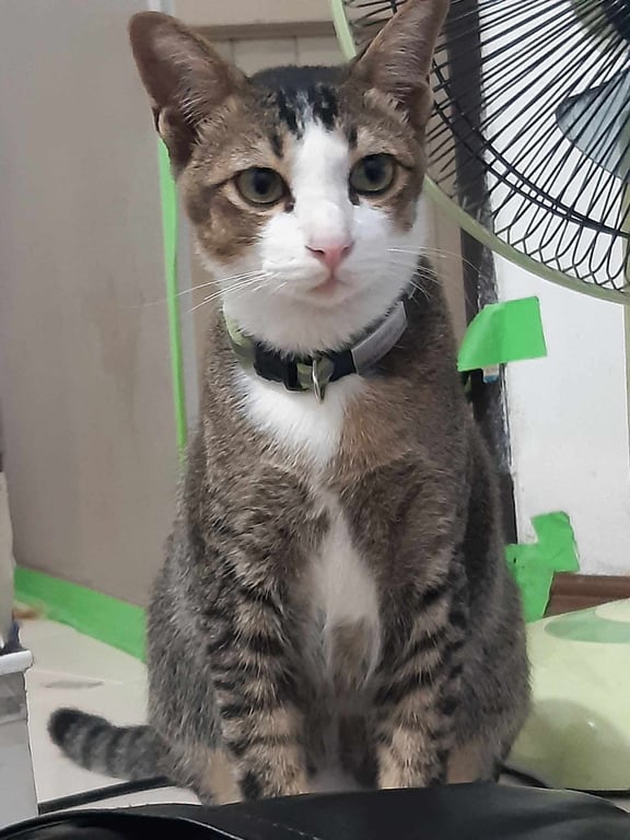 รอยตำหนิ: ปลายหางงอ ลายสลิดเหมือนสวมเสื้อคลุม หน้า+คอขาว อุ้งเท้าข้างนึงมี2สีเป็นแมวขี้เล่น แต่ก็ขี้กลัว พุงย้อยๆ นอนทั้งวัน