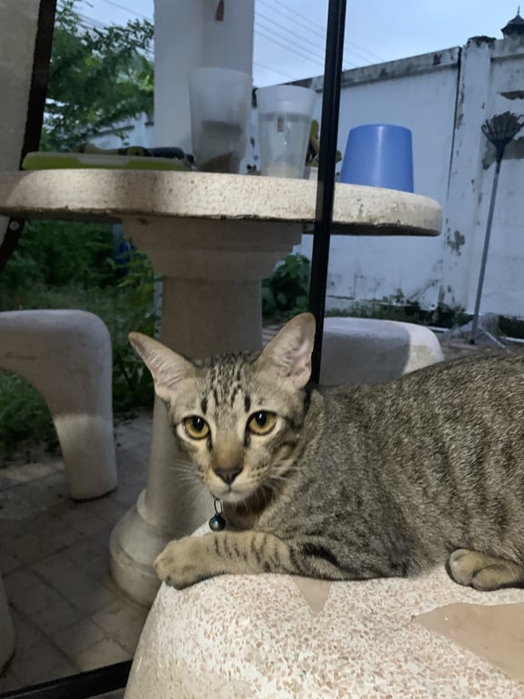 รอยตำหนิ: แมวลายสลิดเทา-ดำ เท้าหลัง-ซ้ายที่นิ้วมีสีขาวนิสัยไม่กลัวคน กินเก่ง ขี้อ้อน อยากรู้อยากเห็น ซน