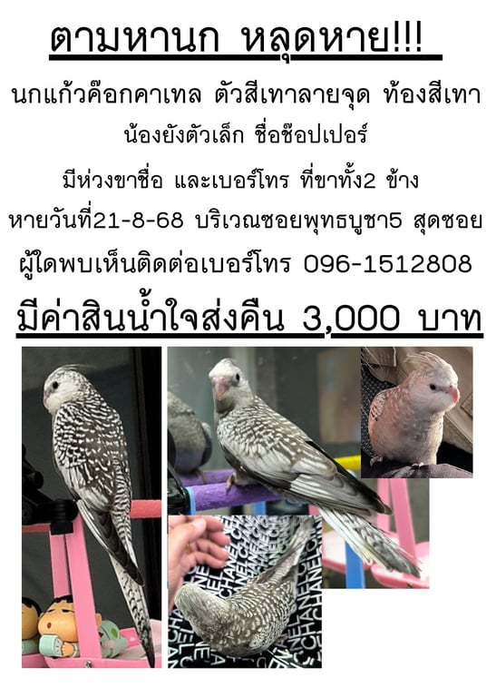 รอยตำหนิ: ตัวลายจุดสีเทา ท้องสีเทาน้องยังเล็ก เสียงร้องก็จะเล็กๆเบาๆ แต่พอคุยด้วยก็จะพยักหน้าตาม มีห่วงขาทั้งสองข้าง ชื่อและเบอร์โทรเจ้าของ